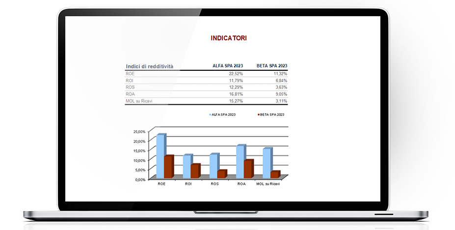 Hai a tua disposizione un fascicolo di analisi completo per valutare la solidità patrimoniale e finanziaria, la liquidità e la redditività dell’azienda.