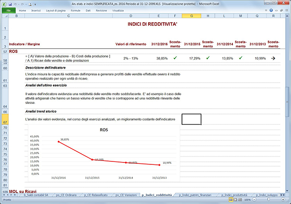 L’analisi permette di elaborare i principali indicatori e margini: indici di redditività, indici patrimoniali e finanziari, indici di produttività, di rotazione, di liquidità e di sviluppo. Gli indicatori forniscono importanti informazioni circa la solidità economica, il rendimento della gestione, la struttura degli investimenti e dei finanziamenti.