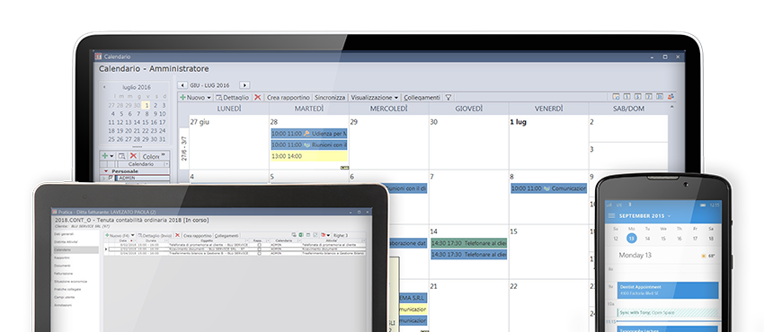 È inoltre possibile definire più calendari condivisi, quali ad esempio “Ferie e chiusure”, “Scadenze normative” etc… STUDIO permette di sincronizzare il calendario con Microsoft Exchange®, Microsoft Office365® oppure Google Calendar®. Tutte le informazioni che servono, a portata di mano, su smartphone o tablet.